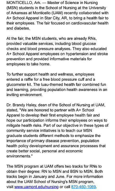 Master of Science in Nursing (MSN) students in the School of Nursing at the University of Arkansas at Monticello (UAM) collaborated with New Bethel Church Ministries in Winchester, Arkansas, to bring a health expo to residents of Drew, Lincoln and Desha counties in July. The expo aimed to improve health outcomes in rural Arkansas communities disproportionately affected by chronic diseases. (more…)