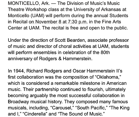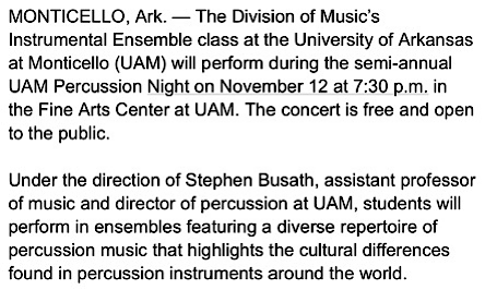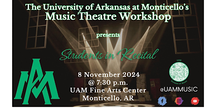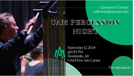 The Concert and Chamber Choirs in the Division of Music at the University of Arkansas at Monticello (UAM) will host the UAM Concert and Chamber Choir in Concert on November 21 at 7:30 p.m. in the Fine Arts Center at UAM. The concert is free and open to the public. (more…)