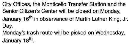CITY CLOSING FOR MARTIN LUTHER KING DAY