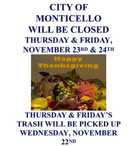CITY OF MONTICELLO Thanksgiving Schedule.