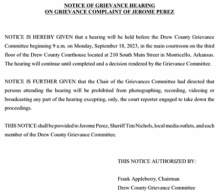 County Issues Notice of Perez Grievance Hearing, Monday, Under Court Conditions, No Recording or Broadcasting