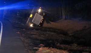 A loaded eastbound chip-truck reportedly entered Dead Man’s Curve too fast, New Year’s Eve morning at 4:30, overturning in the north ditch.