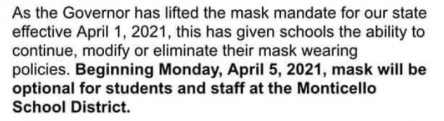Monticello Mayor Paige Chase said, “I won’t extend it (mask requirement) to Monticello. I just hope that our citizens will care for others and be considerate of the health and well being of their family, friends, and others.”