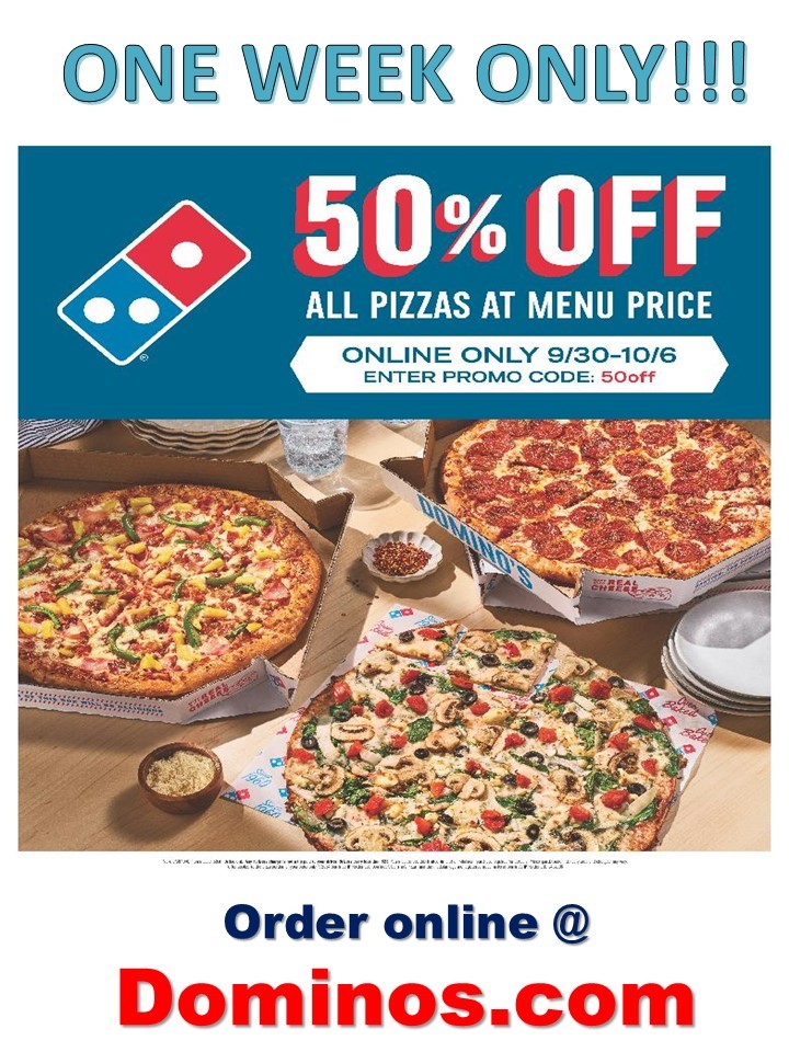 Domino’s 50% Off All Pizzas At Menu Price, One Week Only!!!