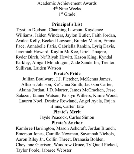 Drew Central Elementary Honor Roll 1st Grade