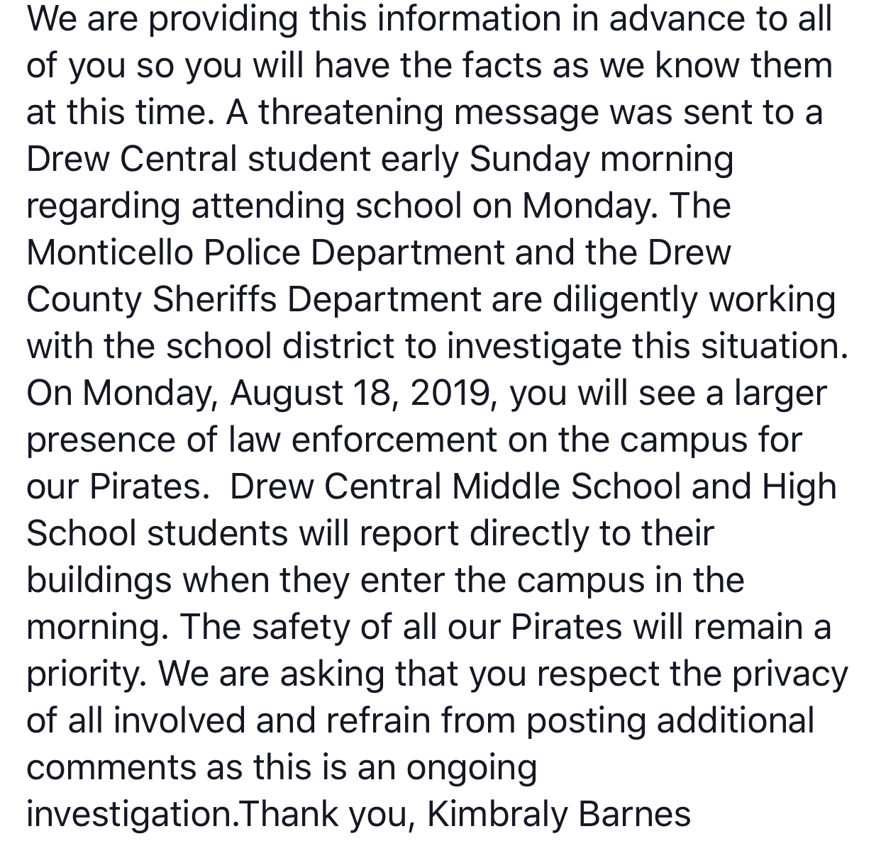 Threat Made To Drew Central Schools – Posted At 6 pm