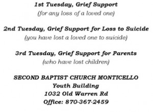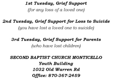 Grief Support Group Schedule at Second Baptist, Tuesdays at 6 pm