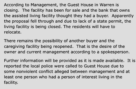 Guest House of Warren Closing, Re-locating 17 Elderly Residents.