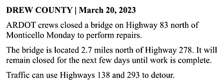 HWY 83 Closed from Allen Drive to Rose Hill Cut Off for Bridge Repair