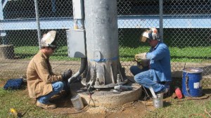 Starko Inc. had been contracted to weld 4 inch by 12 inch gussett plates to the base of the 4 light poles at Hyatt Field, with 12 gussetts being attached to each pole. That began Friday, and continued Saturday and Sunday, until the task was completed.