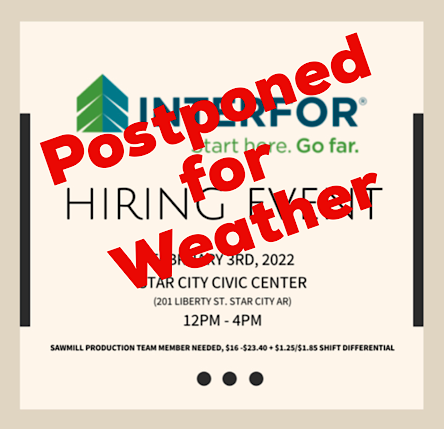 POSTPONED- Interfor Hiring Event, Thursday, Star City Civic Center