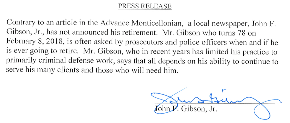 Please click the link below to see a press release issued by John Frank Gibson, a local attorney.