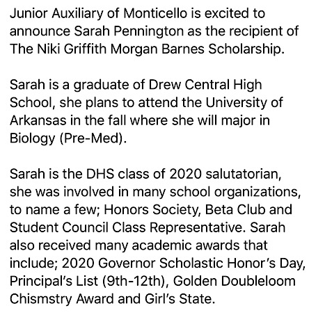 Jr. Auxiliary Scholarship Awarded toSarah Pennington