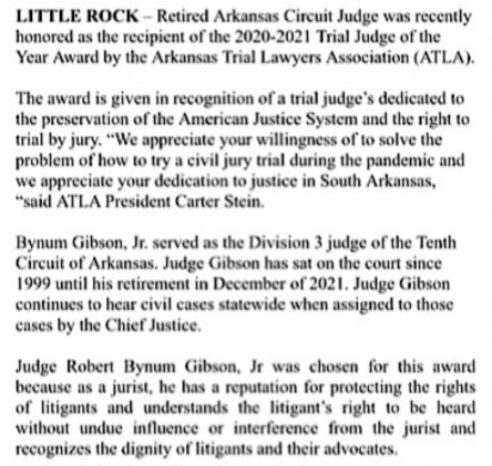 Judge Bynum Gibson Honored as State Trial Judge of the Year