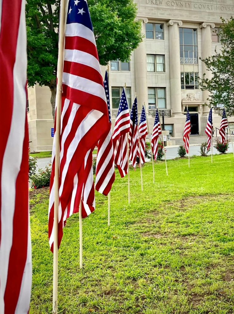 Each year, Monticello residents honor or remember military personnel by purchasing American flags, which are prominently displayed on the City Square and in front of the courthouse. Each flag includes a card recognizing the donor and the individual(s) being honored.