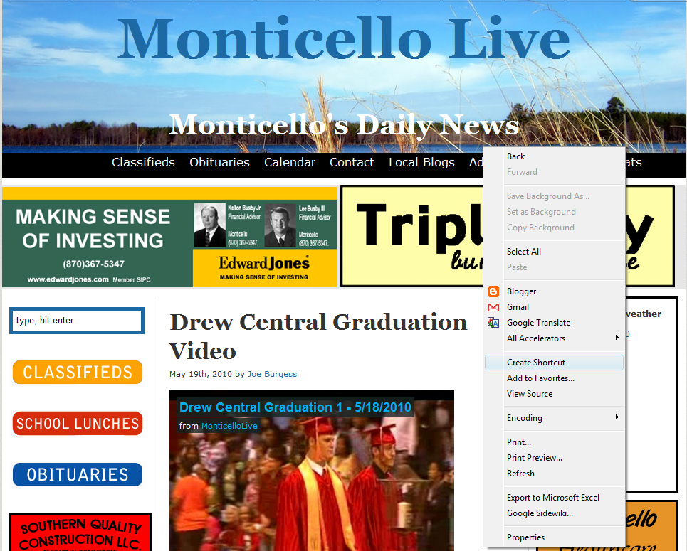 You can save most website as “shortcuts” or “icons” on your desktop by placing you mouse over a blank portion of the site, right clicking on it, and selecting “create shortcut”. Your computer will ask you if you want to, and just click yes. The icon will be there for “one click” access in the future. You can also use that method to go directly to specific pages of websites, such as “classifieds” or “UAM Sports” on MLive, or any page on other sites, to save you wasting time just “passing through” useless pages.