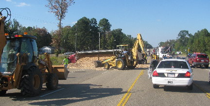 Triple A Towing cleared the load of chips out of the road, set the tractor trailer upright, and removed the vehicles.