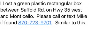 My box was found, thanks to the nice man and his family that found it and returned it and all because of seeing on MonticelloLive.