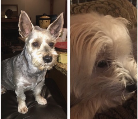 The one on the left is a schnauzer/yorkie mix with salt and pepper hair male, and answers to the name Buckwheat. The one on the right is a mostly white yorkie/snorkie mix female and answers to the name of Wheezer. They were last seen on Towler lane past the Monticello Sports Complex on 278.