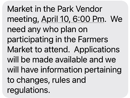Market in the Park Vendor Meeting, Monday, 6:30, at Chamber of Commerce
