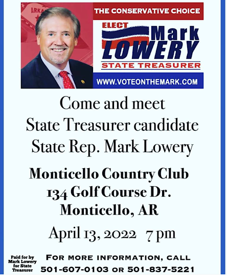Meet State Treasurer Candidate Mark Lowery, Tonight, in Monticello