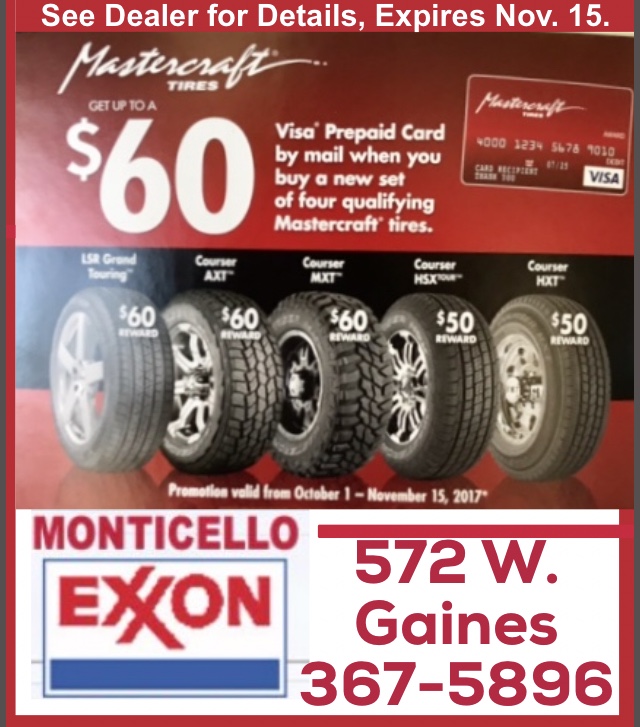 Monticello Exxon, Up To $60 Gift Card, with Purchase of 4 Mastercraft Tires