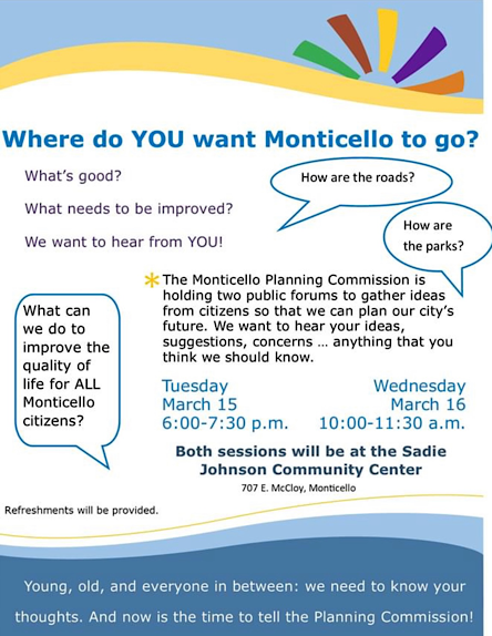 Monticello Planning Commission Public Forums to Gather Citizen’s Ideas, Tuesday & Wednesday