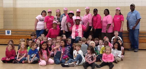 Friday, October 18th was declared ‘Go Pink Day’ at Monticello Pre-K. The staff and students wore Pink to honor a Pre-K Staff member, Mrs. Pam Dunlap, who is a cancer survivor. The students and staff members cheered Mrs. Dunlap on as she prepared to walk in Little Rock at the annual Race for the Cure. Mrs. Dunlap was presented with flowers, balloons, caps and a pink tote bag filled with an assortment of pink gifts. In her honor the Pre-K staff members were also presented with pink tote bags.