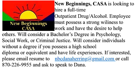 New Beginnings, CASA Seeking Outpatient Drug/Alcohol Employee