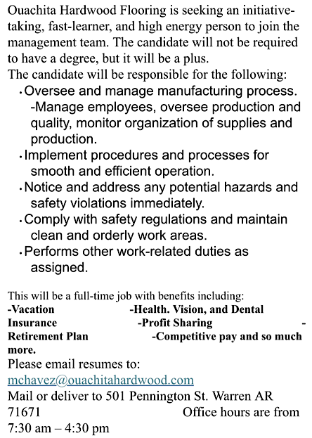 Ouachita Hardwood Flooring Seeking Supervisor