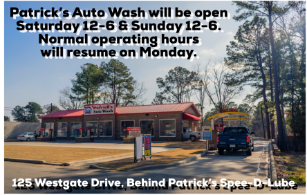 Patrick’s Auto Wash will be open Saturday & Sunday, 12-6. Let Us Get that Snow, Ice & Sand Off of your Vehicle
