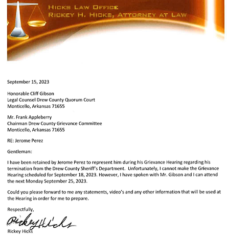Perez’ Lawyer’s Letter Requesting Grievance Hearing be Continued