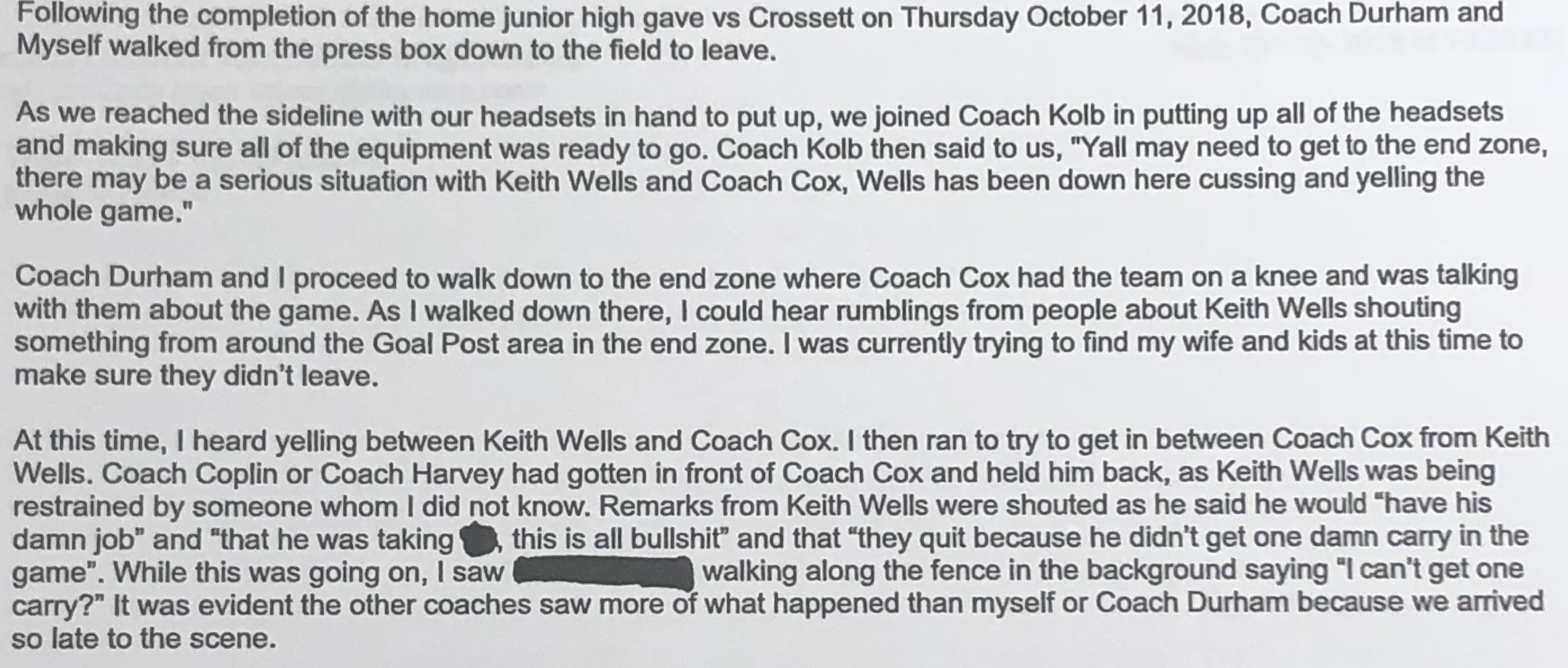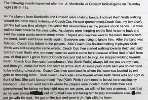 What: According to the attached documents, Keith Wells approached the junior high football coach, Tyler Cox, after the game, angered by the amount of playing time that his son had received in the game.