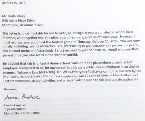 Wells has been advised that any situation in the future of this nature will result in him being banned from any further activities/events on Monticello school campuses, as would be the case with any other parent or resident.