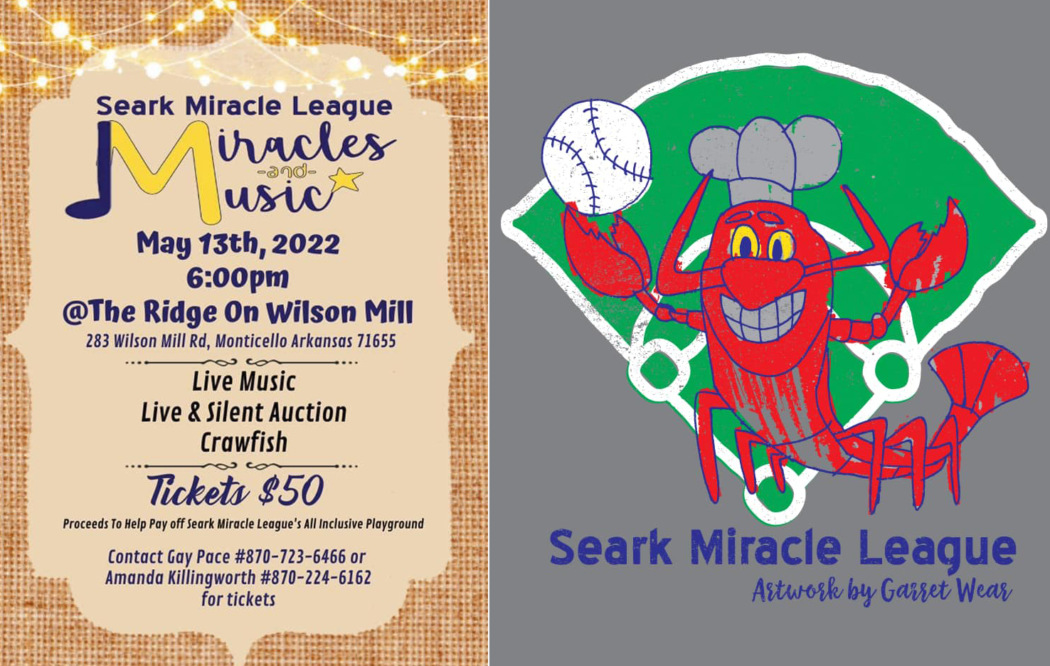 We are very close to paying off the loan for the Miracle League Park, we all love so dearly. To help with doing that we are having a fundraiser dinner (Crawfish Dinner, Live Music, Live & Silent Auction, Tickets $50) Tickets can be purchased from Gay Pace #870-723-6466 or Amanda Killingworth #870-224-6162. Miracles & Music will be held at The Ridge on Wilson Mill, Friday May 13th starting at 6:oopm