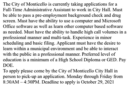 Comments Off on City of Monticello Seeking Full-Time Parks Laborers