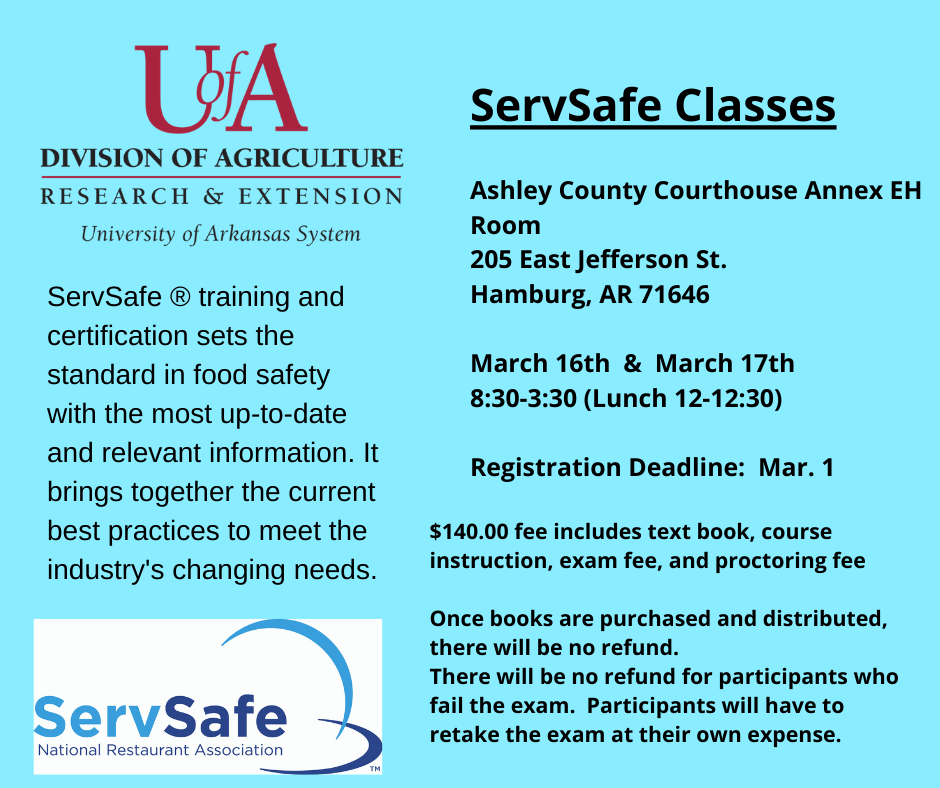 University of Arkansas, Cooperative Extension Service will make this training available to your Food Managers in Ashley County and surrounding areas. The two day training will yield 10 hours credit.