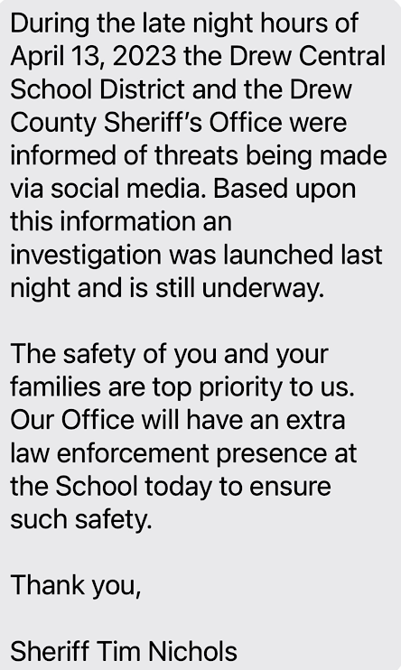 Jacob Andrew Bennett, a former Drew Central student, accepted a guilty plea to the charge of “threatening to commit an act of mass violence on school property”, earlier this week, in reference to the April Drew Central school threat, referenced below.