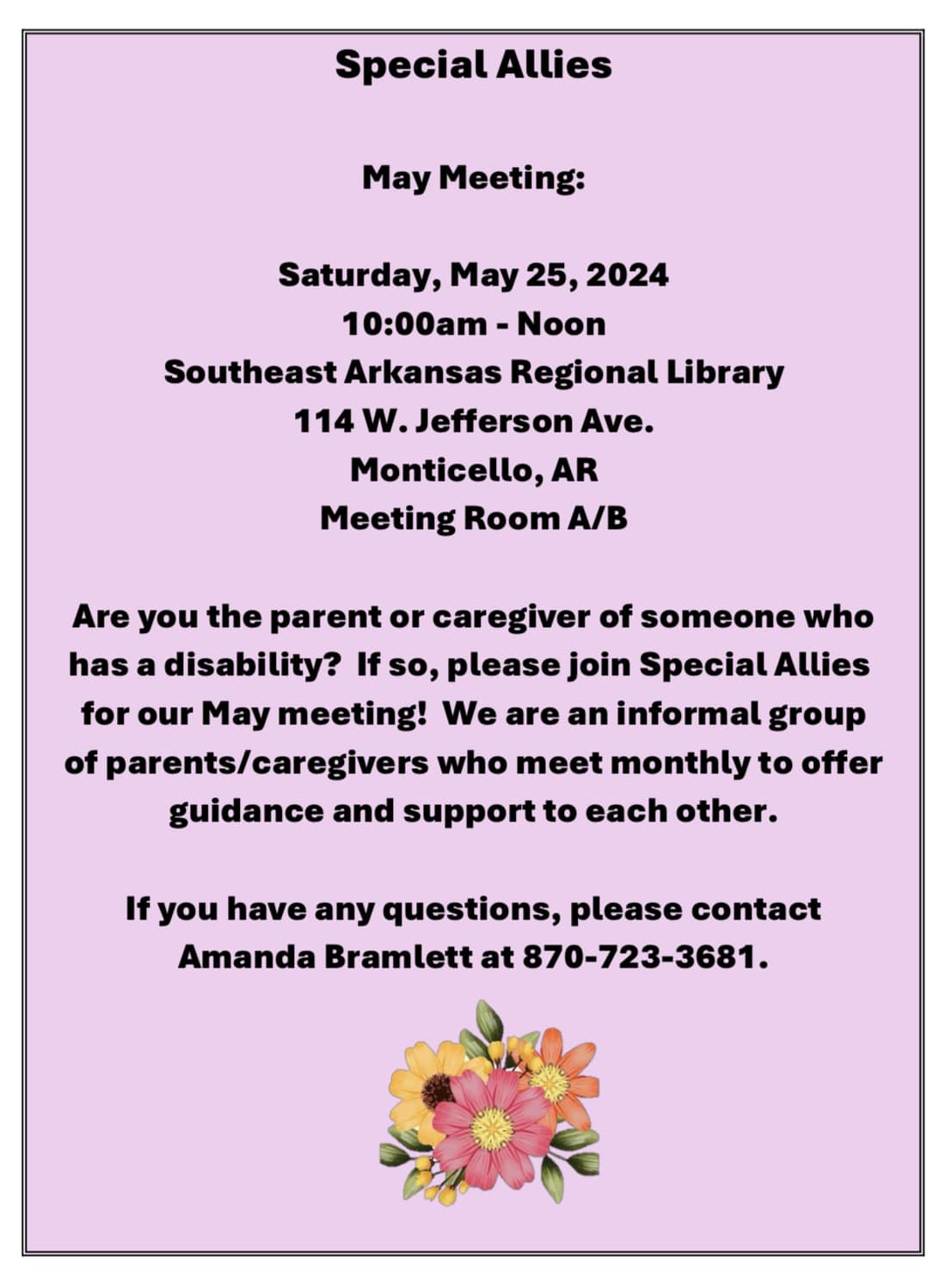 CANCELED – Special Allies Parent/Caregiver Group Meeting May 25th