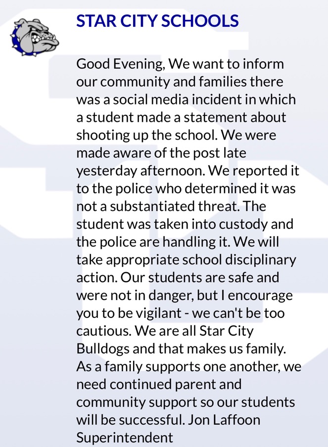 B6EBBFC6-AF69-4F8F-BD36-3D21B52352D8Star City Schools Issued the following statement, following a threat made by a student, in social media.
