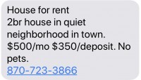 Ideally looking for a clean house that is 2-3 bedrooms in a nice and quiet neighborhood. I’m moving from Texas to work with the University of Arkansas. Please call or text me at 713-454-3016 if you have a home available or know someone who does. Thanks.