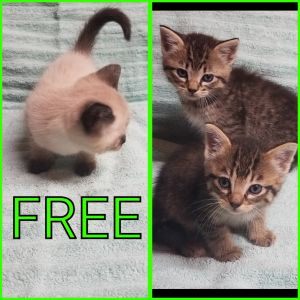 1 1/2 year old female tabby cat, GREAT mouser, 2 tabby kittens and 1 solid black kitten, litterbox trained 7 weeks old.