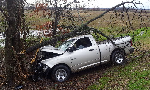 The driver lost control of the Dodge pick-up, which struck a large tree. The impact caused a large tree limb to fall onto the vehicle.