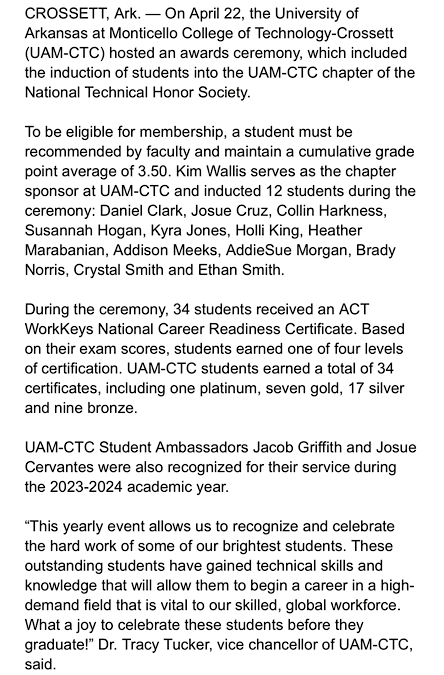 UAM-CTC Student Awards, National Technical Honor Society Induction