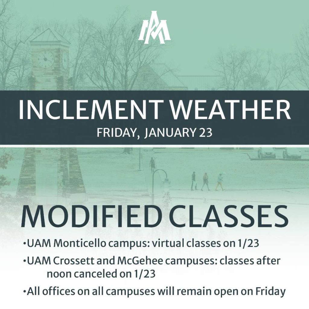 Due to the potential for hazardous road conditions and icy surfaces beginning on Friday, January 23, the University of Arkansas at Monticello (UAM), the UAM College of Technology-Crossett (UAM-CTM) and the UAM College of Technology-McGehee (UAM-CTM) will operate on modified class schedules.