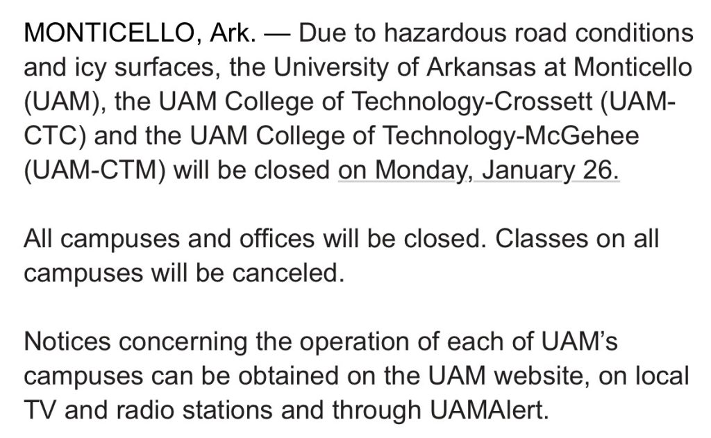 UAM To Close on January 26 Due To Inclement Weather
