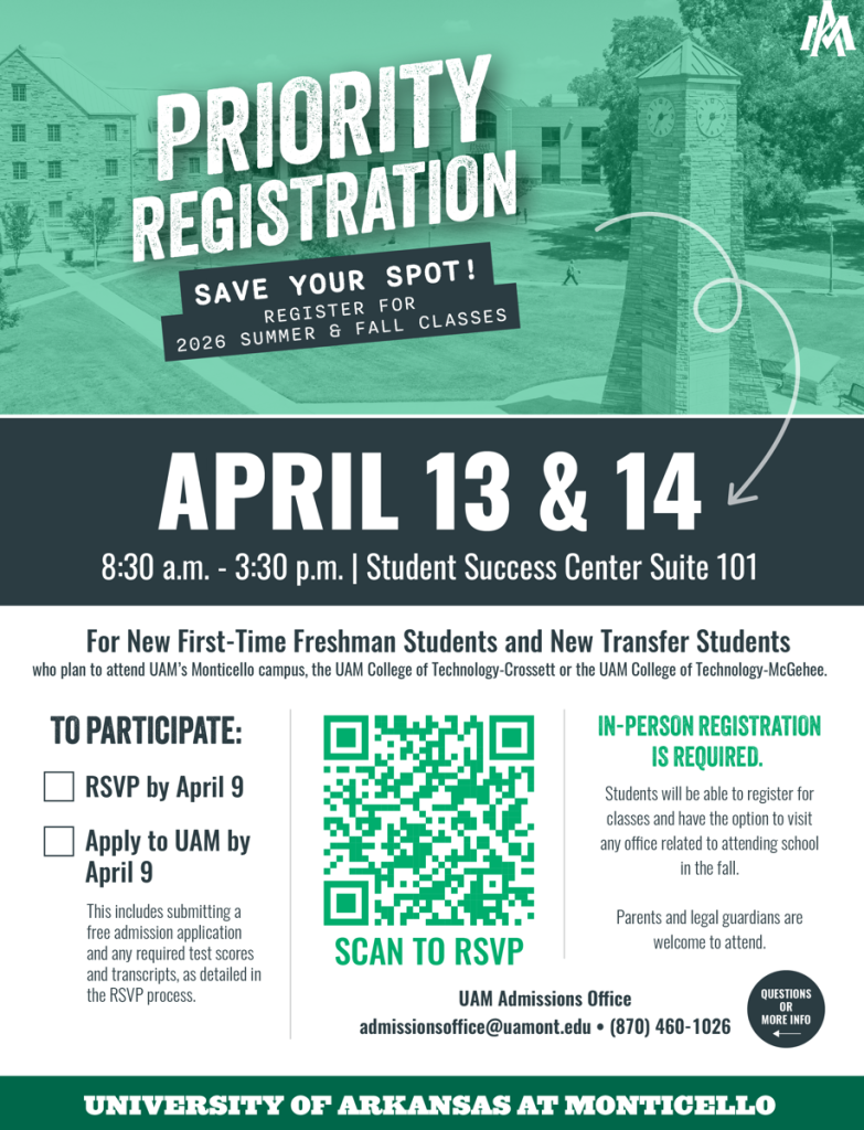 The University of Arkansas at Monticello (UAM) will hold a priority registration event for summer 2026 and fall 2026 classes on April 13 and April 14 from 8:30 a.m. to 3:30 p.m. in the Student Success Center. This event is for new first-time freshman students and new transfer students who plan to attend UAM’s Monticello campus, the UAM College of Technology-Crossett (UAM-CTC) or the UAM College of Technology-McGehee (UAM-CTM).