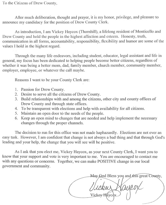 Vickey Haycox Announces Candidacy For County Clerk Election