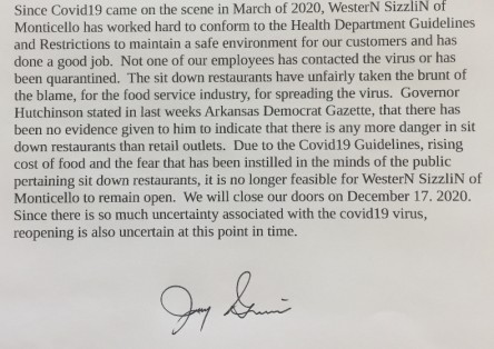 Western Sizzlin has been a Monticello landmark for years. It has been the epicenter of family reunions, after-church lunches, and club meetings, as well as a place to simply get good home-cooked food in a relaxed and friendly atmosphere. I would encourage EVERY Monticello citizen to mask-up and take your family to dinner before this institution of local good will and sociability locks its doors. Let’s show our support for Mr. Jimmy and the Western Sizzlin family!