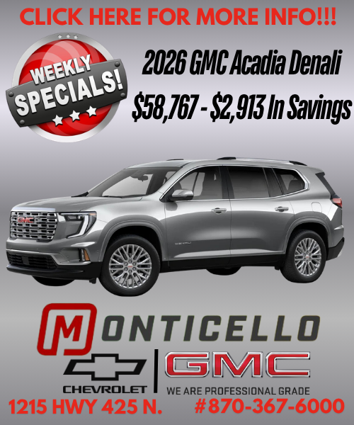 ARDOT will begin milling the town square beginning this Sunday, April 19, 2026 beginning at 6:00 p.m. they will mill this area Sunday night, Monday and Tuesday nights tentatively beginning at the same time on the subsequent nights. We are sorry for any inconvenience that this may cause and thank you for your patience as we continue to rebuild Monticello’s roads and infrastructure.